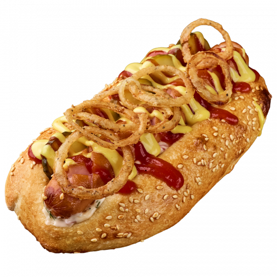 Milk sausage, American mustard, Ketchup, Sesame, Onion fries, Mayonnaise, Cucumber salted, Tartar sauce, Chicken egg, Mozzarella cheese, Yeast dough