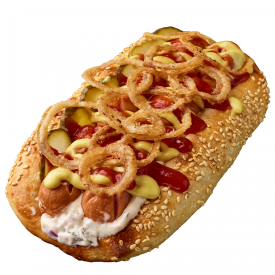 Milk sausage, American mustard, Ketchup, Sesame, Onion fries, Mayonnaise, Cucumber salted, Tartar sauce, Chicken egg, Mozzarella cheese, Yeast dough