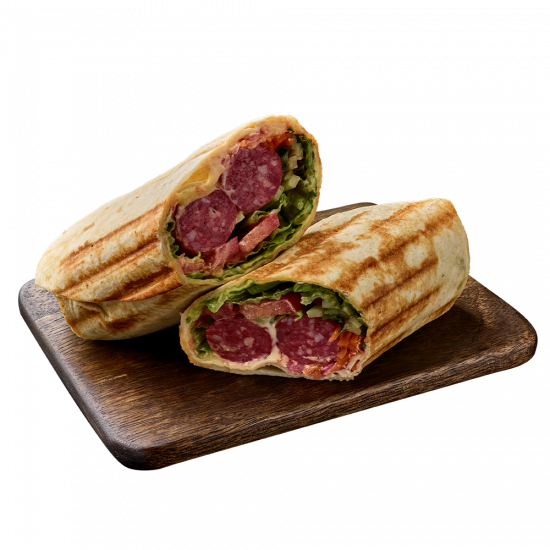 Bavarian sausage, American mustard, Ketchup, Mayonnaise, Carrot, Cucumber, Tomato, Wheat tortilla, Butter, Cheese Sauce, Lettuce leaf