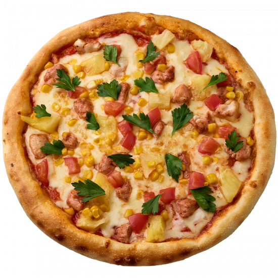 Chicken fillet, Pineapple, Сorn, Parsley, Tomato, Tomato sauce, Mozzarella cheese, Yeast dough