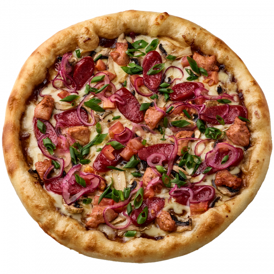 Hunting sausages, Chicken fillet, Green onion, Pickled onions, Tomato, Jack Daniels sauce, Champignon mushrooms, Mozzarella cheese, Yeast dough