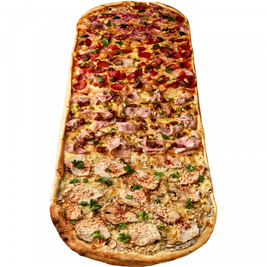 Bacon, Hunting sausages, Chicken fillet, Mortadella, Pepperoni, Veal, Mustard granular, Canned Mushrooms, Champignon mushrooms, Pistachio, Truffle salsa, Parmesan cheese, Tomato sauce, Cream sauce, Sauce Green herbs, Cream, Sun-dried tomatoes, Parsley, Smoked paprika, Pickled onions, Caramelized onions, Tomato, Mozzarella cheese, Yeast dough