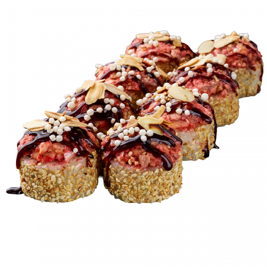 Угорь, Авокадо, Икра масаго, Крем-сыр, Миндальные хлопья, Огурец, Рисовые шарики, Соус свит чили, Соус спайси, Соус унаги, Нори, Рис заправленный, Салат Айсберг