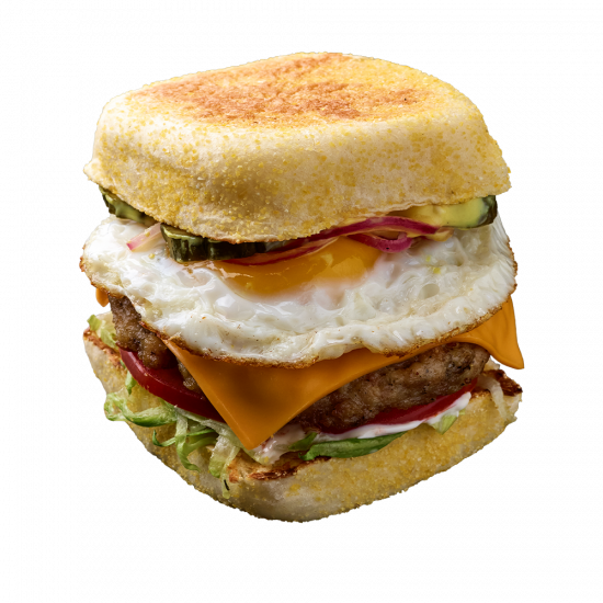 Котлета из куриного бедра, Горчица американская, Инглиш маффин, Лук красный репчатый, Майонез, Огурцы соленые, Помидор, Соус сливочный, Сыр чеддер, Яйцо куриное, Салат Айсберг
