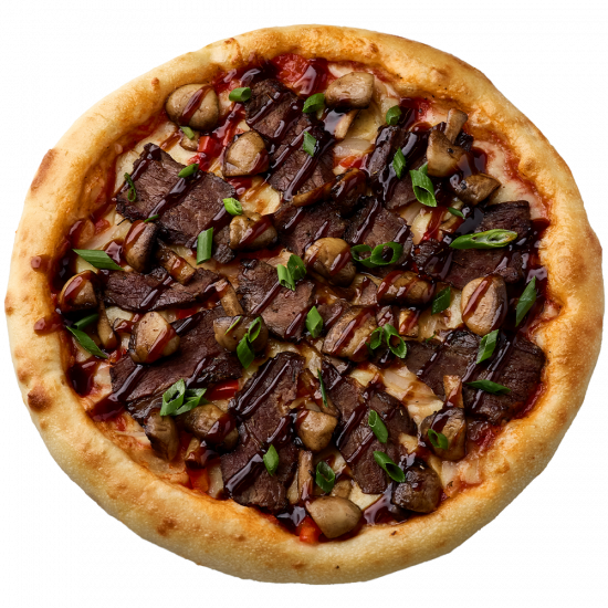 Телятина, Лук белый репчатый, Лук зеленый, Перец сладкий, Соус Барбекю, Соус томатный, Шампиньоны, Сыр моцарелла, Тесто дрожжевое