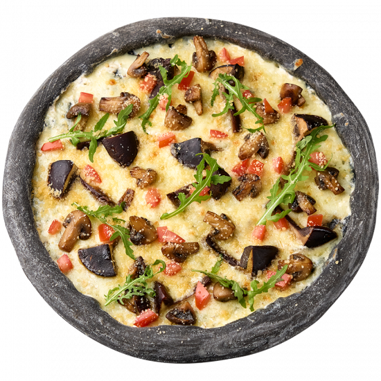 польский/белый гриб, Сливки, Сыр пармезан, Трюфельная сальса, Чернила каракатицы, Чеснок, Шампиньоны, Сыр моцарелла, Тесто дрожжевое, Руккола