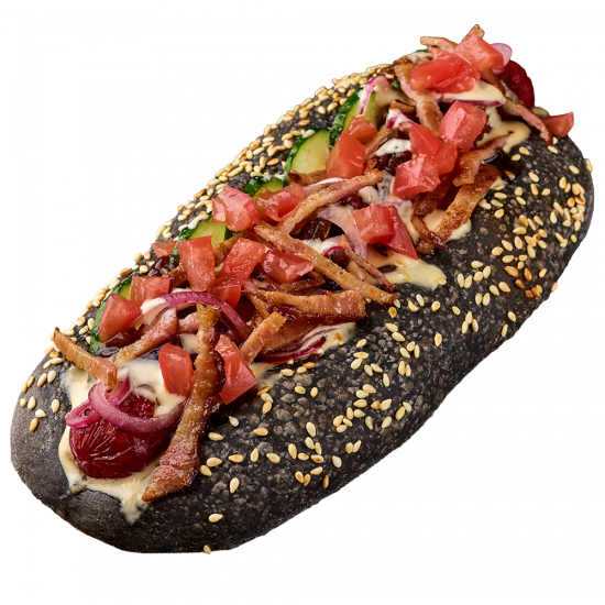 Колбаска баварская, Бекон, Кунжут, Лук карамелизированный, Огурец, Помидор, Соус Джек Дэниэлс, Соус сырный, Чернила каракатицы, Сыр моцарелла, Тесто дрожжевое