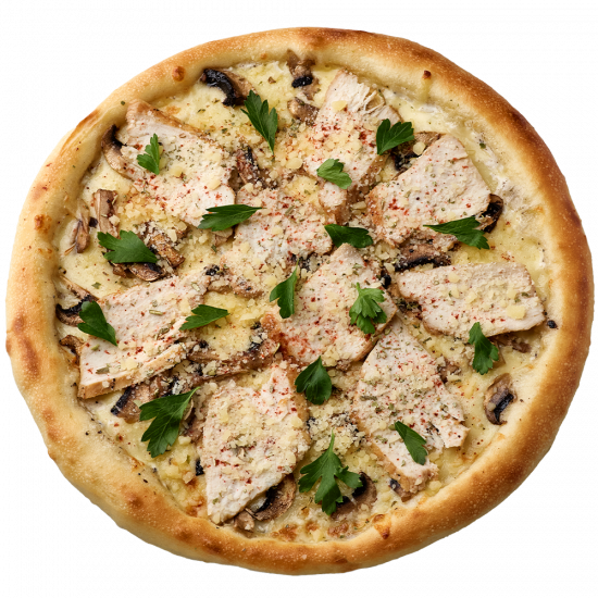 Куриное филе, Паприка копчёная, Петрушка, Сливки, Соус сливочный, Сыр пармезан, Трюфельная сальса, Шампиньоны, Сыр моцарелла, Тесто дрожжевое