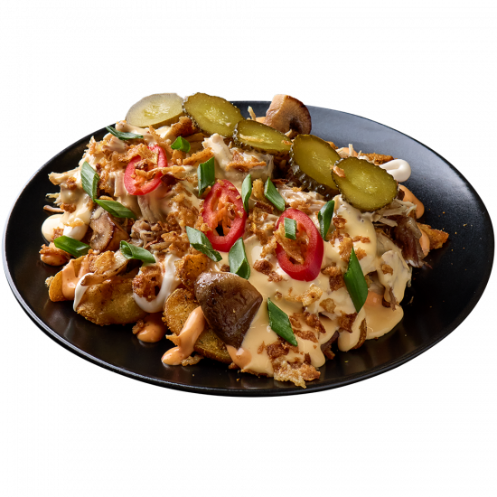 Томленая свинина, Картофельные дольки, Лук зеленый, Лук-фри, Майонез, Огурцы соленые, Перец чили, Сметана, Соус спайси, Соус сырный, Шампиньоны