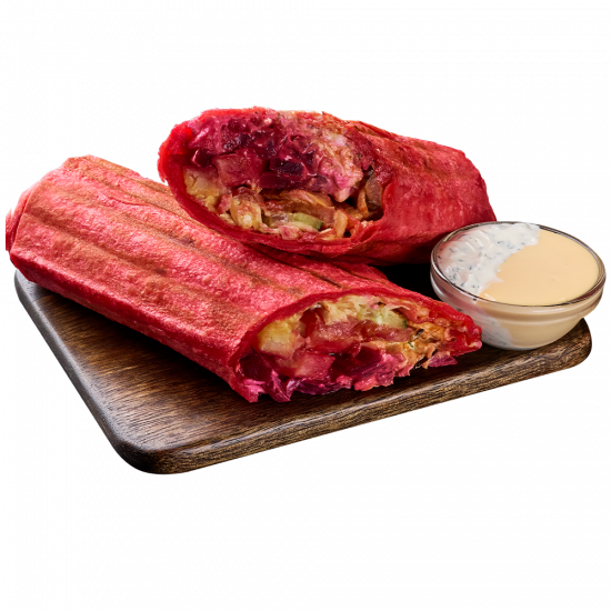 Куриное бедро, Кавказские специи, Свекла, Сыр плавленый, Соус сырный, Соус сливочный, Соус Ранч, Соус от Шефа, Помидор, Капуста, Горчица американская, Огурец, Майонез, Лук маринованный, Лук зеленый, Лаваш, Картофель-фри, Огурцы соленые