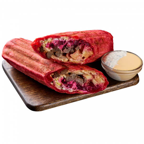 Телятина, Капуста, Картофель-фри, Лаваш, Лук маринованный, Майонез, Огурец, Огурцы соленые, Горчица американская, Свекла, Соус от Шефа, Соус Ранч, Соус сливочный, Соус сырный, Сыр плавленый, Помидор