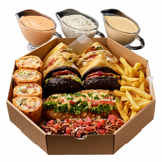 Брекфаст инглиш маффин Чикен, Бургер Джек Дениелс Мини, Бурум с курицей, Хот-дог Джек Дэниэлс, Хот-дог Цезарь, Картофель-фри, Соус Ранч, Соус спайси, Соус сырный