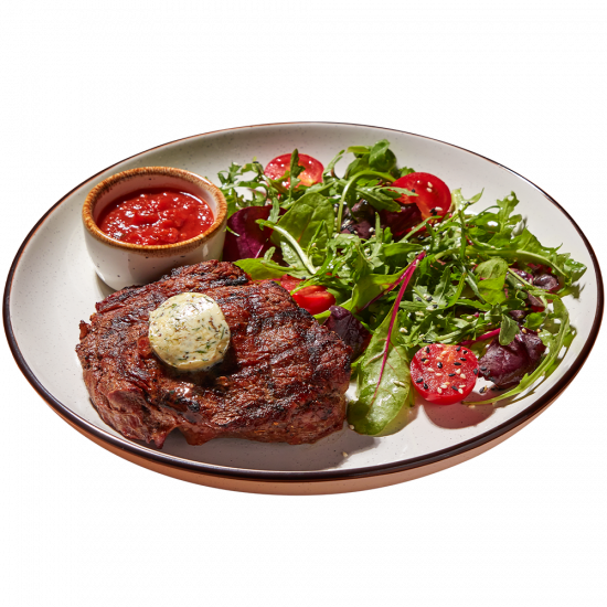Выдержанная говядина, Зелень укропа, Кунжут, Лимон, Оливковое масло, Петрушка, Помидор, Сливочное масло, Томатная сальса, Чеснок, Бейби шпинат, Руккола, Салат Булс блад, Щавель Кровавая Мэри