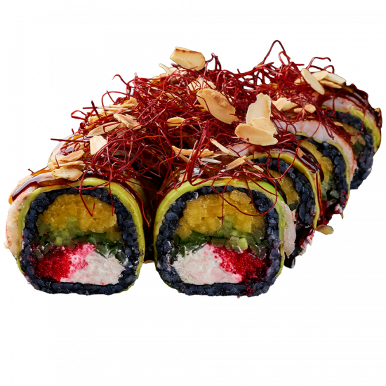Креветка тигровая, Икра масаго, Крем-сыр, Манго, Миндальные хлопья, Огурец, "Ниточки" чили, Соус унаги, Чернила каракатицы, Авокадо, Соус Манго, Нори, Рис заправленный