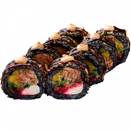 Лосось запечений, Ікра масаго, Крем-сир, Манго, Огірок, Соус спайсі, Соус Унагі, стружка тунця, Чорнило каракатиці, Норі, Рис заправлений