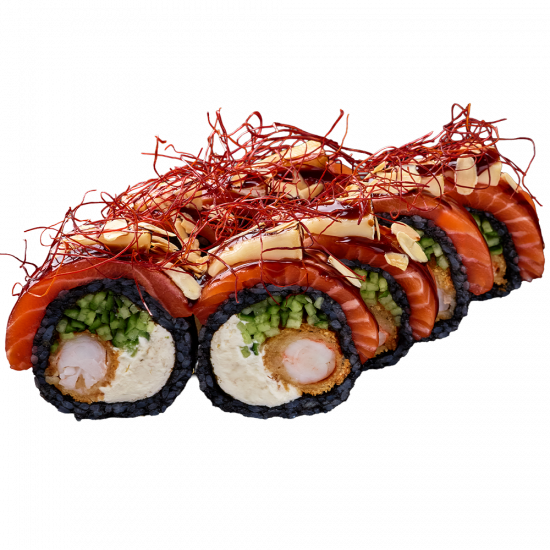 Лосось, Креветка-панко, "Ніточки" чилі, Крем-сир, Мигдалеві пластівці, Огірок, Соус Унагі, Сир Камамбер, Чорнило каракатиці, Норі, Рис заправлений