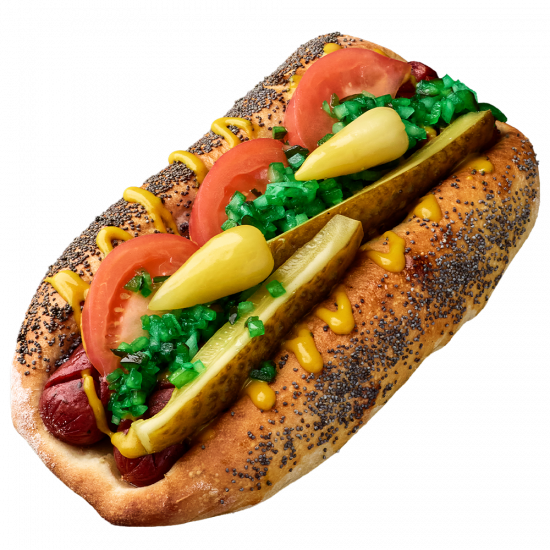 Ковбаска баварська, Гірчиця американська, Гірчиця зерниста, Цибуля бiла, Маринований гострий перчик, Огірок солоний, Помідор, Реліш, Насіння маку, Куряче яйце, Тісто дріжджове
