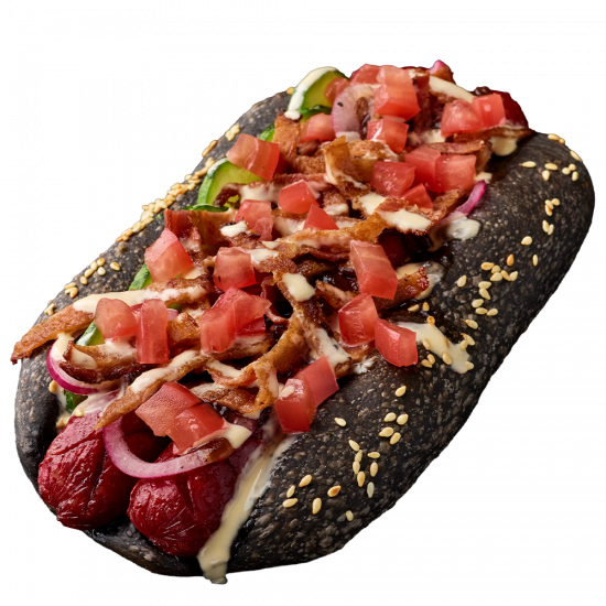 Ковбаска баварська, Бекон, Кунжут, Цибуля карамелізована, Цибуля маринована, Огірок, Помідор, Соус Джек Деніелс, Соус сирний, Чорнило каракатиці, Тісто дріжджове