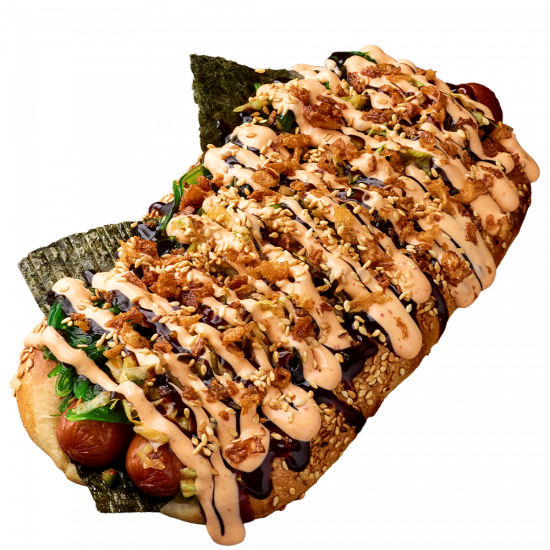 Ковбаска куряча, Гірчиця американська, Кунжут, Цибуля бiла, Цибуля-фрі, Майонез, Огірок, Салат Чука, Соус кiм чi, Соус спайсі, Соус Теріякі, Куряче яйце, Норі, Тісто дріжджове