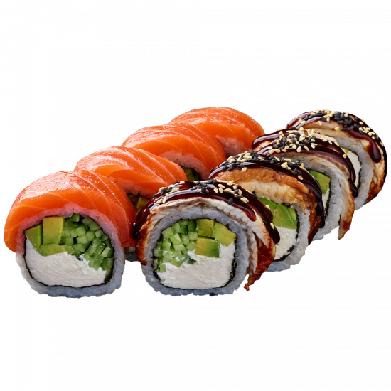 Лосось, вугор, Авокадо, Крем-сир, Кунжут, Огірок, Соус Унагі, Норі, Рис заправлений