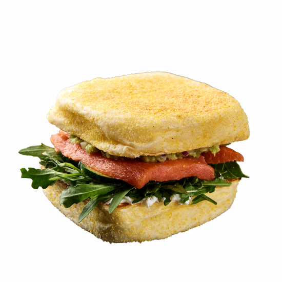 Лосось х/к, Авокадо, Інгліш мафін, Крем-сир, Цибуля маринована, Огірок, Рукола