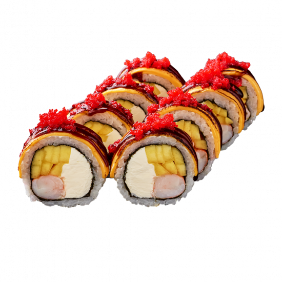 Креветка тигрова, Крем-сир, Манго, Соус Унагі, Сир чеддер, Норі, Рис заправлений