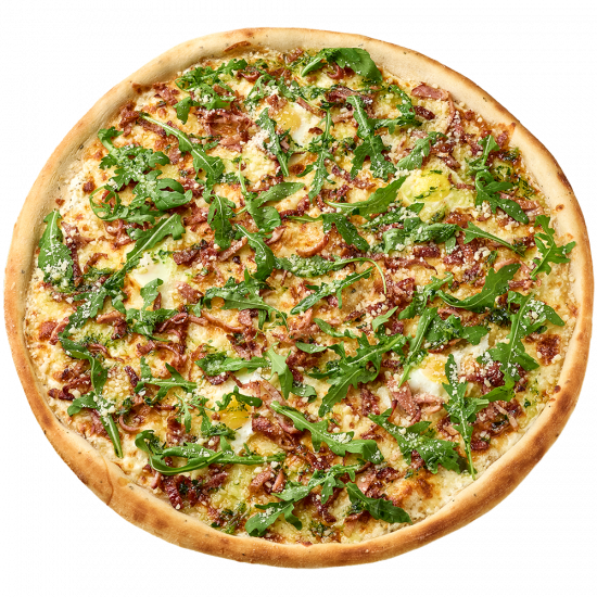 Бекон, Соус Зеленi трави, Соус вершковий, Сир пармезан, Яйце перепелине, Сир моцарелла, Тісто дріжджове, Рукола