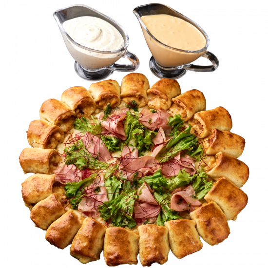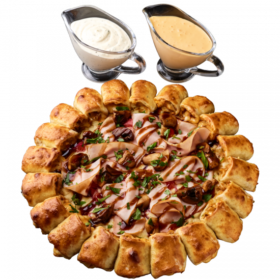 Шинка, Куряче стегно, Цибуля карамелізована, Цибуля маринована, Петрушка, Помідор, Соус Барбекю, Соус Ранч, Соус вершковий, Соус сирний, Гриби печериці, Східні спеції, Сир моцарелла, Тісто дріжджове