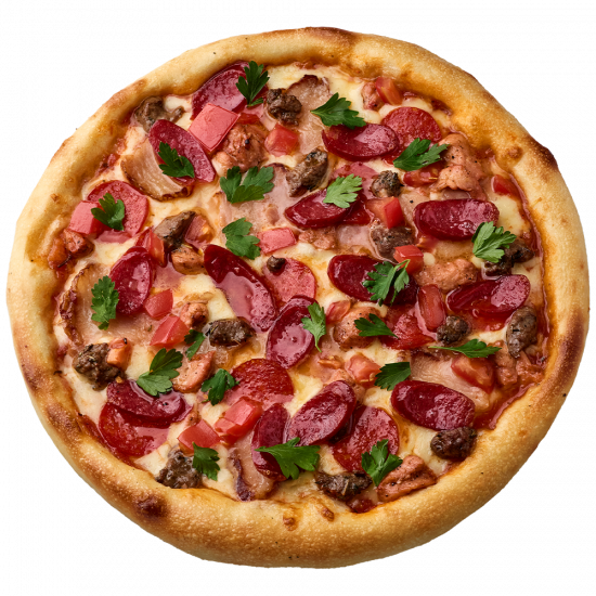 Бекон, Ковбаски мисливські, Куряче філе, Пеппероні, Телятина, Петрушка, Помідор, Соус томатний, Сир моцарелла, Тісто дріжджове