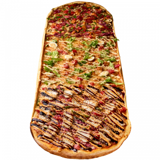 Ковбаски мисливські, Куряче філе, Цибуля зелена, Соус цезар, Яйце перепелине, Гриби печериці, Сир пармезан, Цибуля маринована, Спаржева квасоля, Кунжут, Соус Теріякі, Соус спайсі, Соус Джек Деніелс, Помідор, Перець солодкий, Соус томатний, Сир моцарелла, Тісто дріжджове, Лист салату