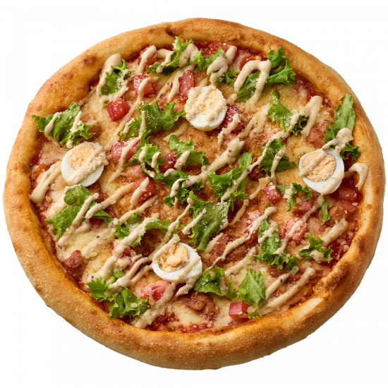 Куряче філе, Помідор, Соус томатний, Соус цезар, Сир пармезан, Яйце перепелине, Сир моцарелла, Тісто дріжджове, Лист салату