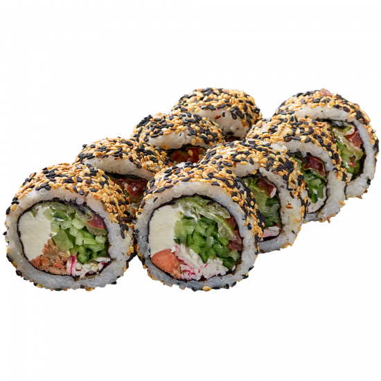 "Сніговий краб", Лосось запечений, Крем-сир, Кунжут, Огірок, Помідор, Норі, Рис заправлений, Лист салату