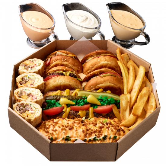 Бургер Блю Чіз Міні, Хот-дог Чотири сиру, Хот-дог Чікаго, Чізбургер, Шаурма с телятиной и картофелем, Картофель-діп, Соус Ранч, Соус спайсі,