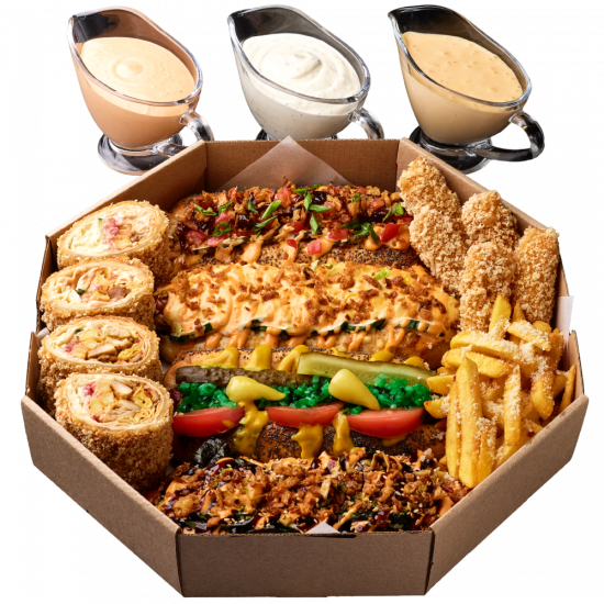 Хот-дог з томленою свининою, Хот-дог Теріякі, Хот-дог Чотири сиру, Хот-дог Чікаго, Шаурма-панко з куркою і картоплею, Картопля-фрi, Соус Ранч, Соус спайсі, Соус сирний, Сир пармезан, Сирні палички-фрі