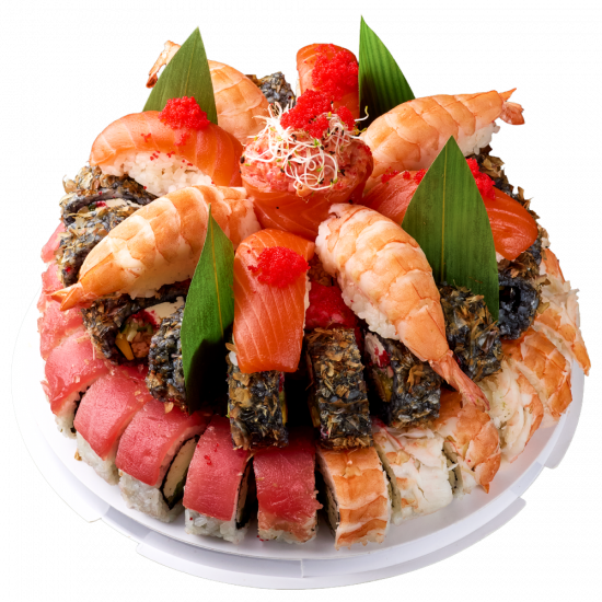 Ауміне рол, Гаваї рол, Гункан сяке со спайси эби, Йокогама рол, Каліфорнія рол, Нігірі Сякє 4 шт., Нігірі ебі 4 шт., Сацуке рол, Серце Дракона рол, Токіо рол